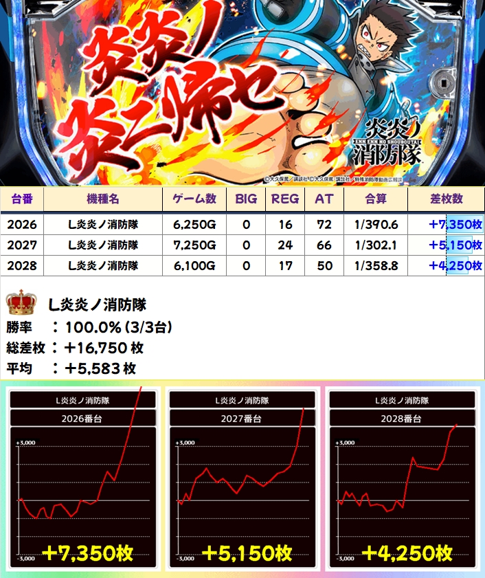 炎炎や沖ドキゴージャスからは大量獲得台がありますが、最新のいざ番長なども仕掛けに絡んで結果を残しました。また、ノーマルのアイムにも複数台優秀台があり+1000枚超台を数多く確認!