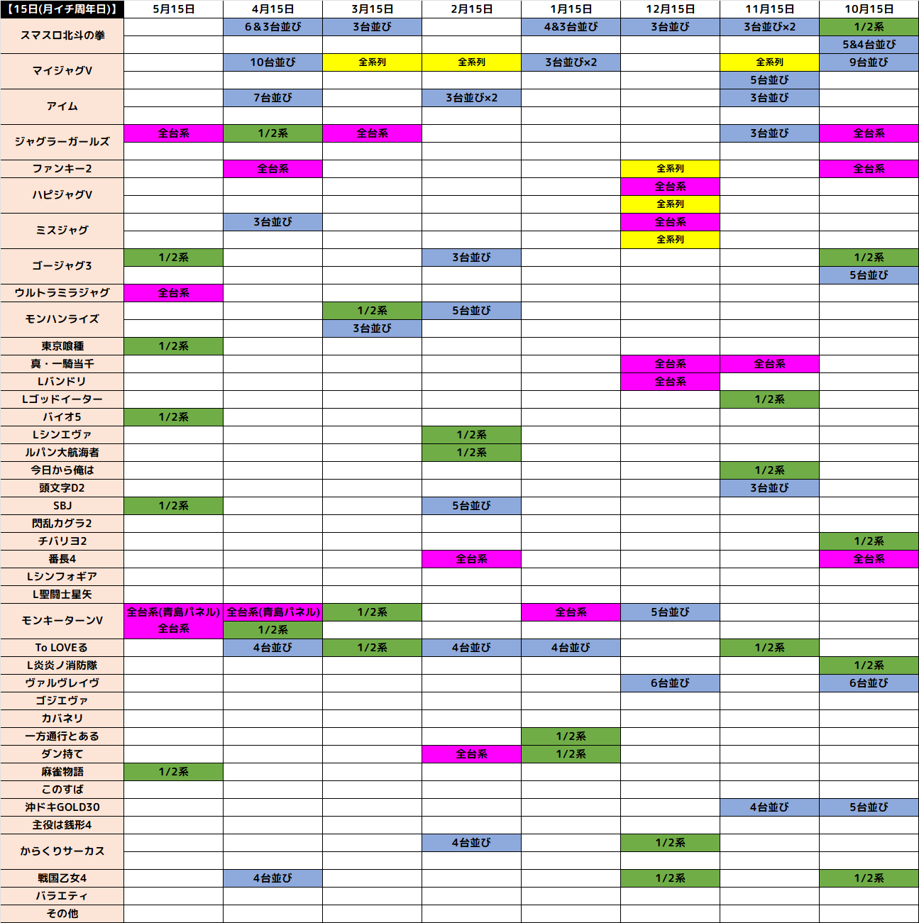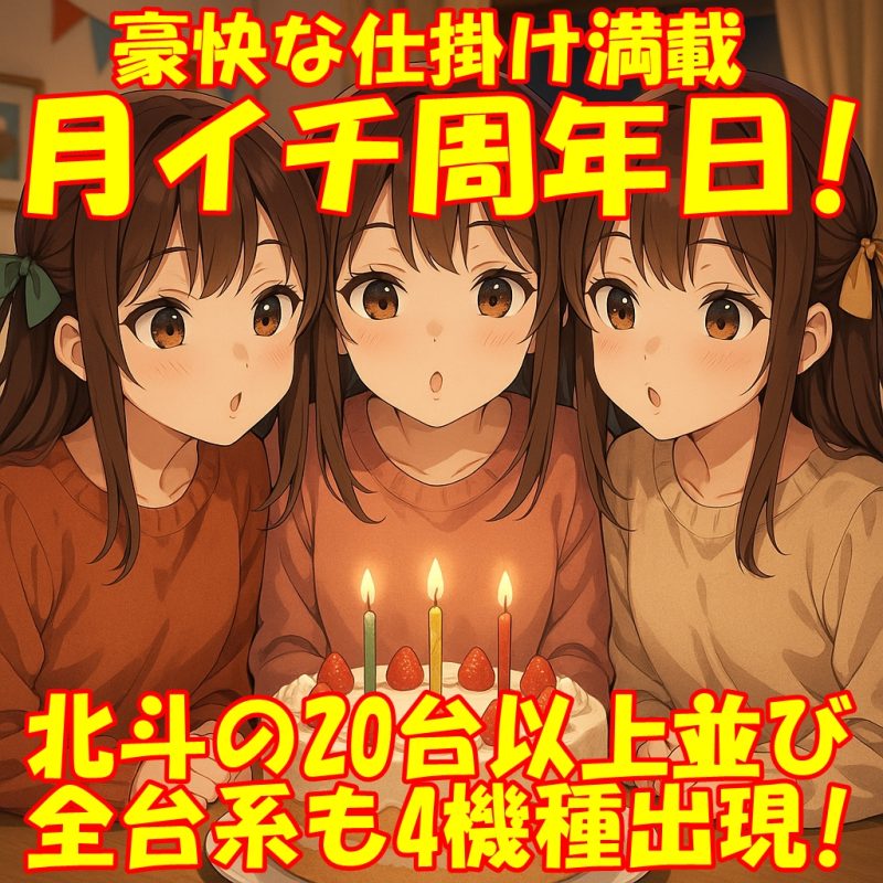 ド本命の「スマスロ北斗の拳」は1/2系以上かつ、月イチ周年日の目玉である10台以上並びもあり!