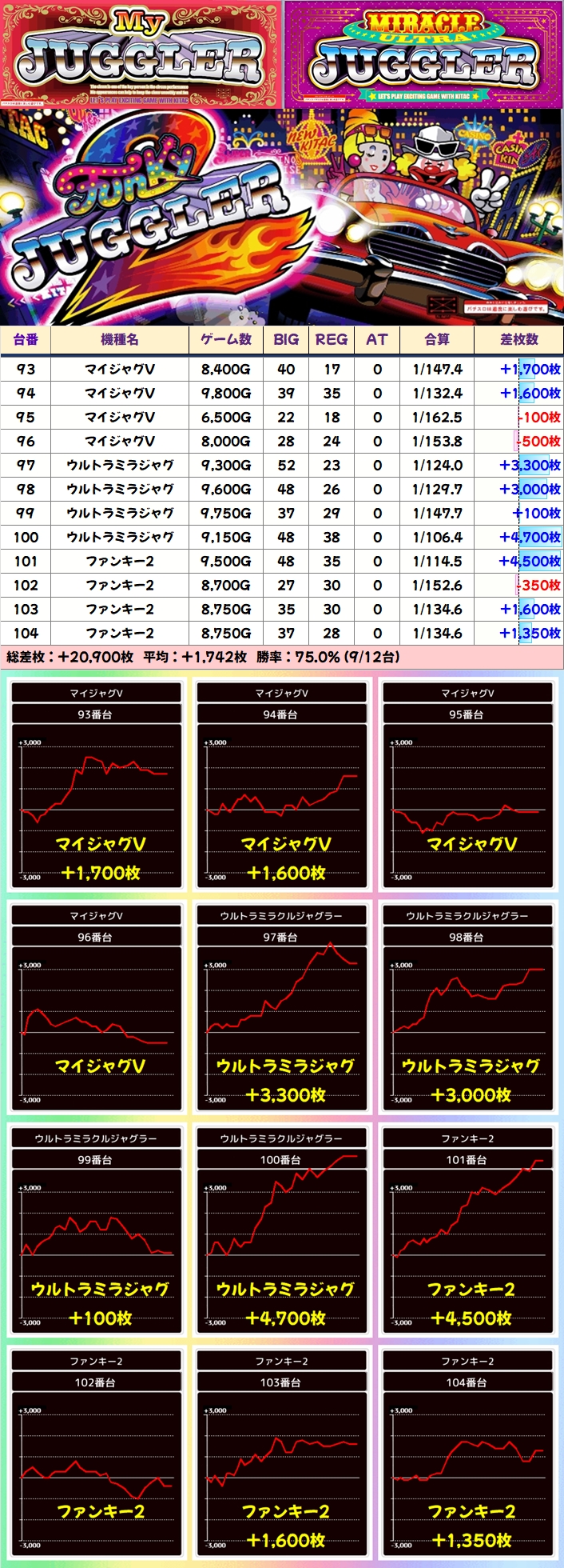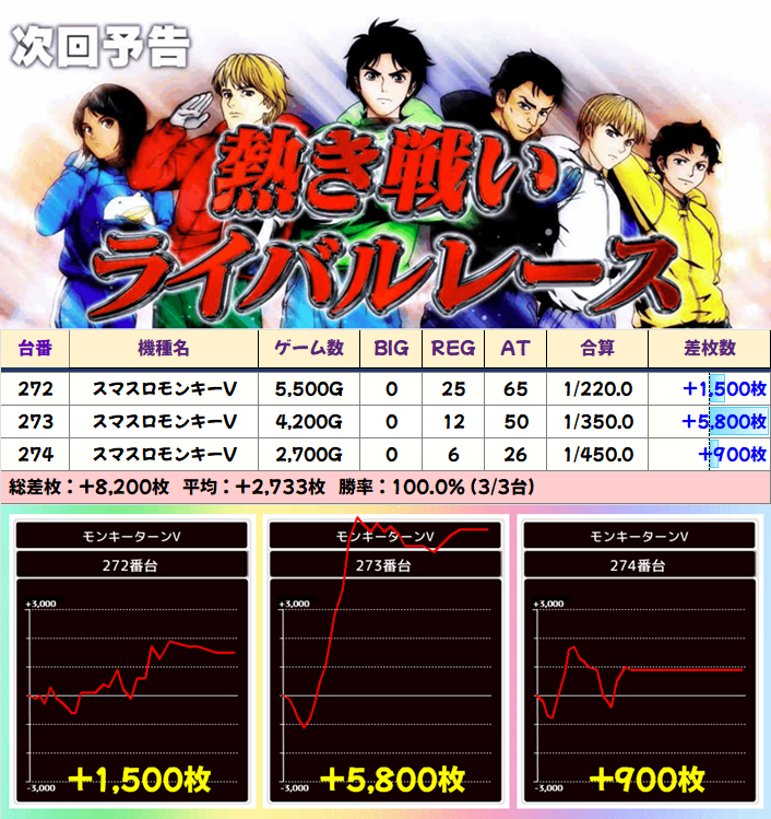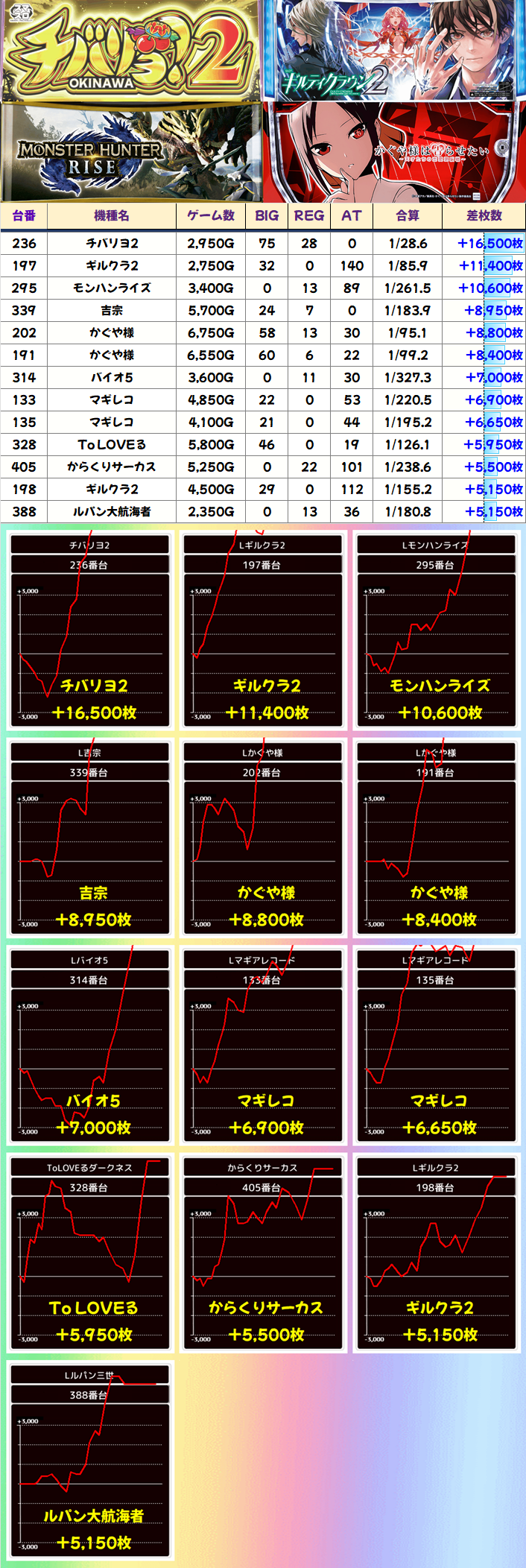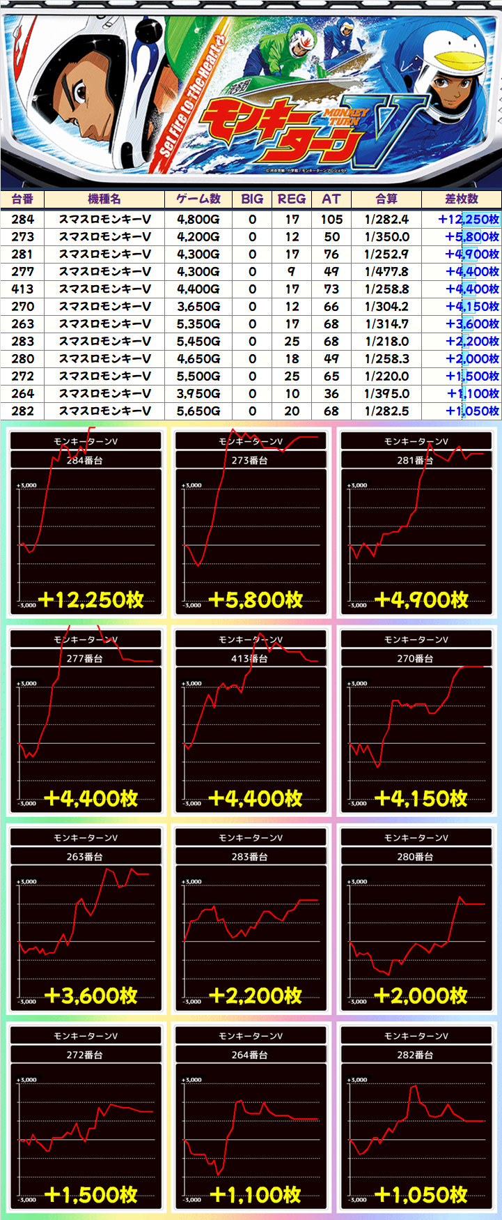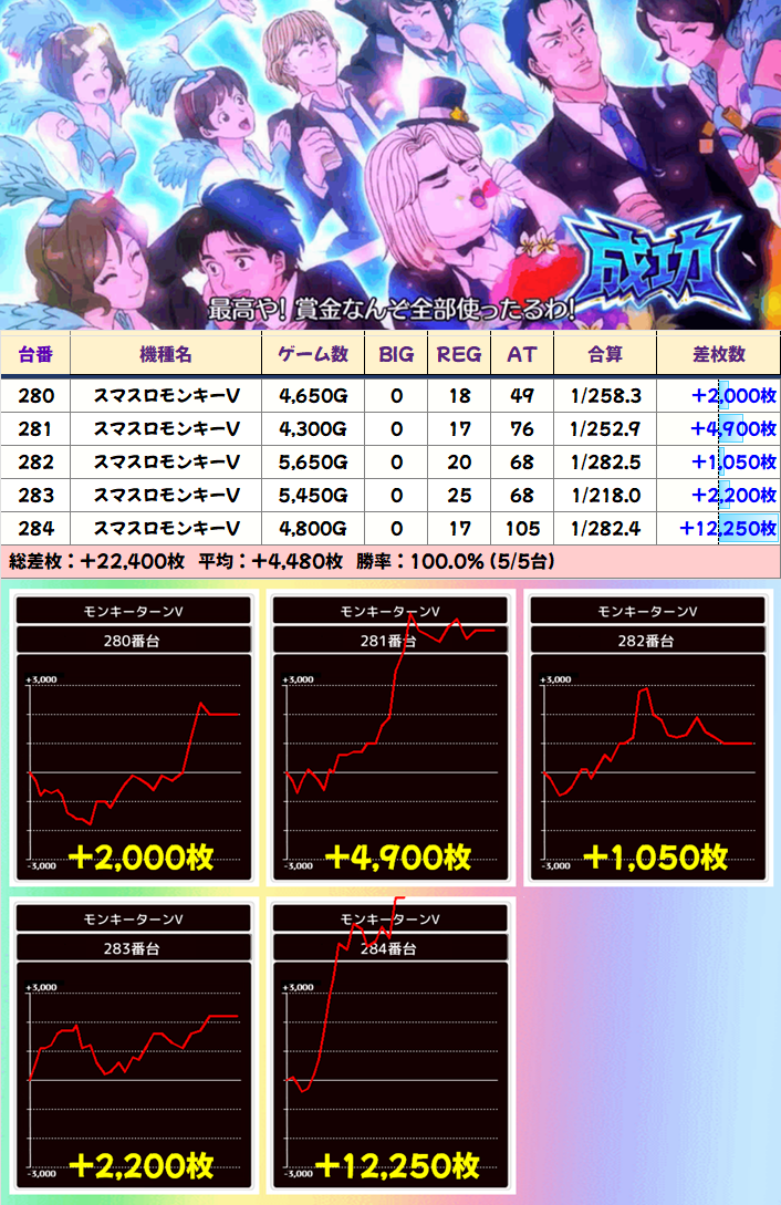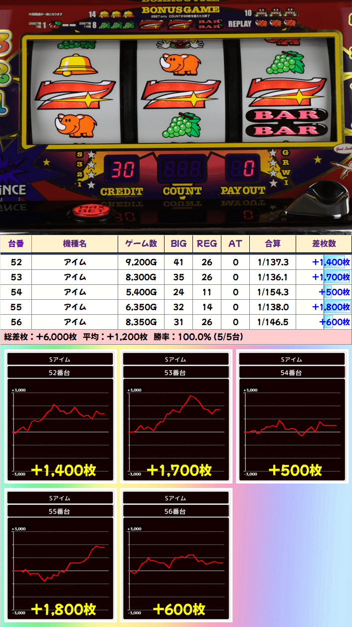 +8150枚を筆頭に半数の4台が+3000枚以上としっかり結果を残していました!