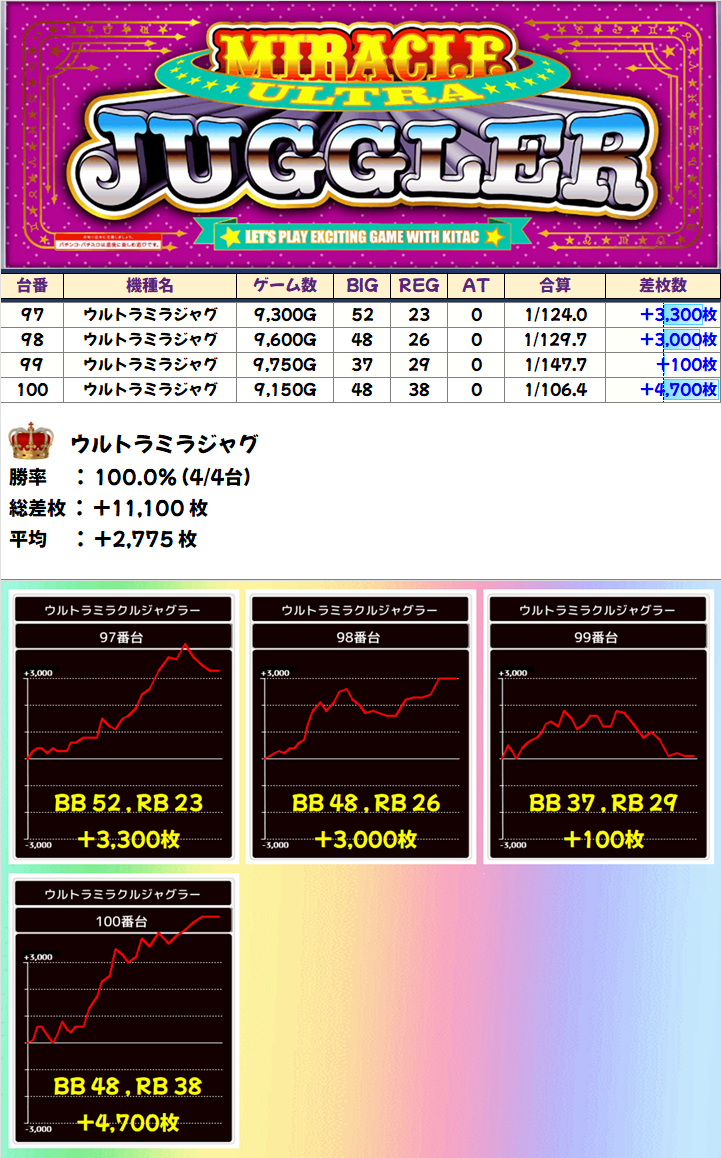 「ゴージャグ3」は圧倒的な高勝率、「ウルトラミラジャグ」は+4700枚を筆頭に4台中3台が+3000枚以上とミラクルな出玉を叩き出しました!