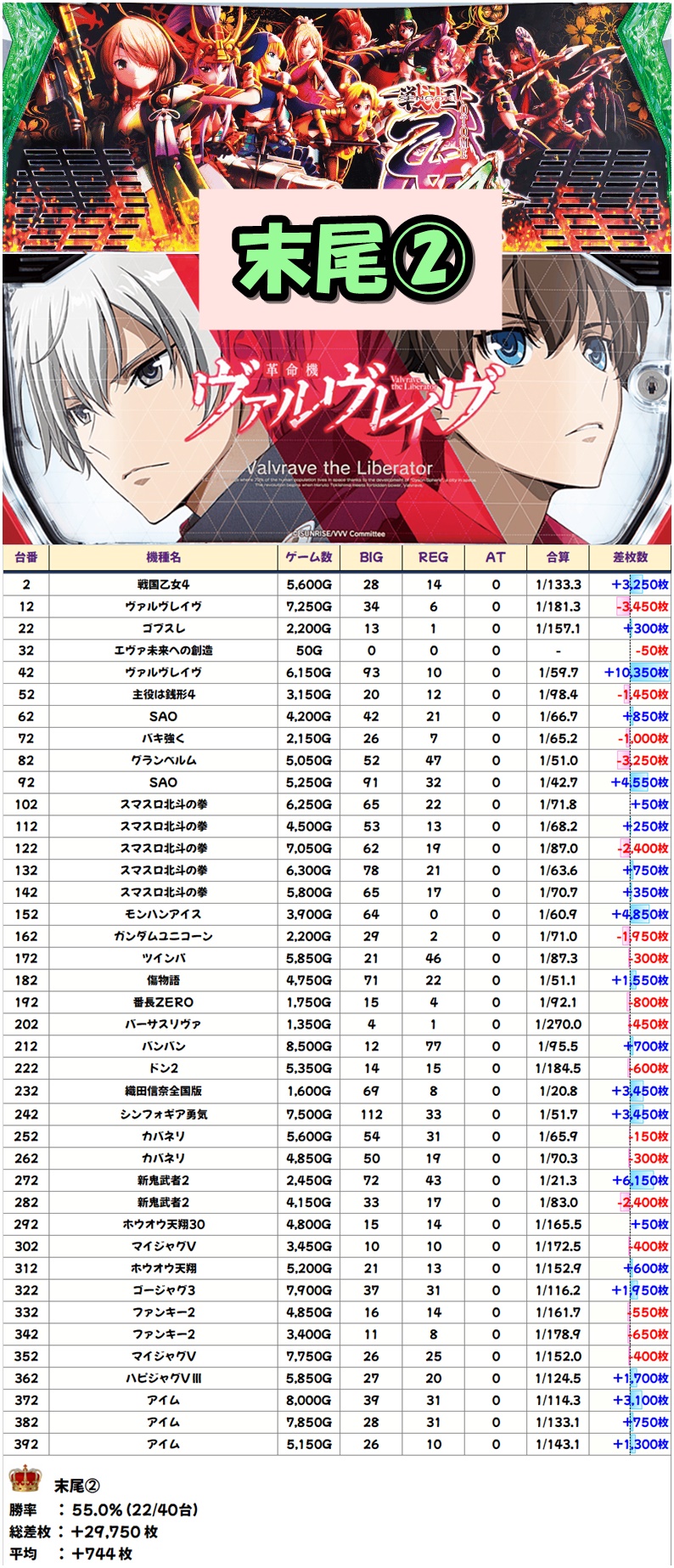 という事で、今回も「末尾②」が強かったですね! 22/40でプラスとなり、平均も+744枚と申し分なしの結果でした!