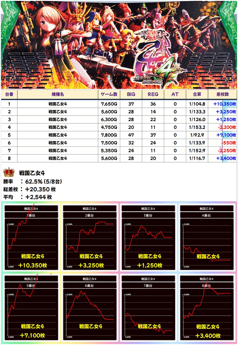 戦国乙女4からもニブイチ以上はありそうな結果となりました。1番台からは万枚オーバー、5番台からは7000枚オーバーとなりました!