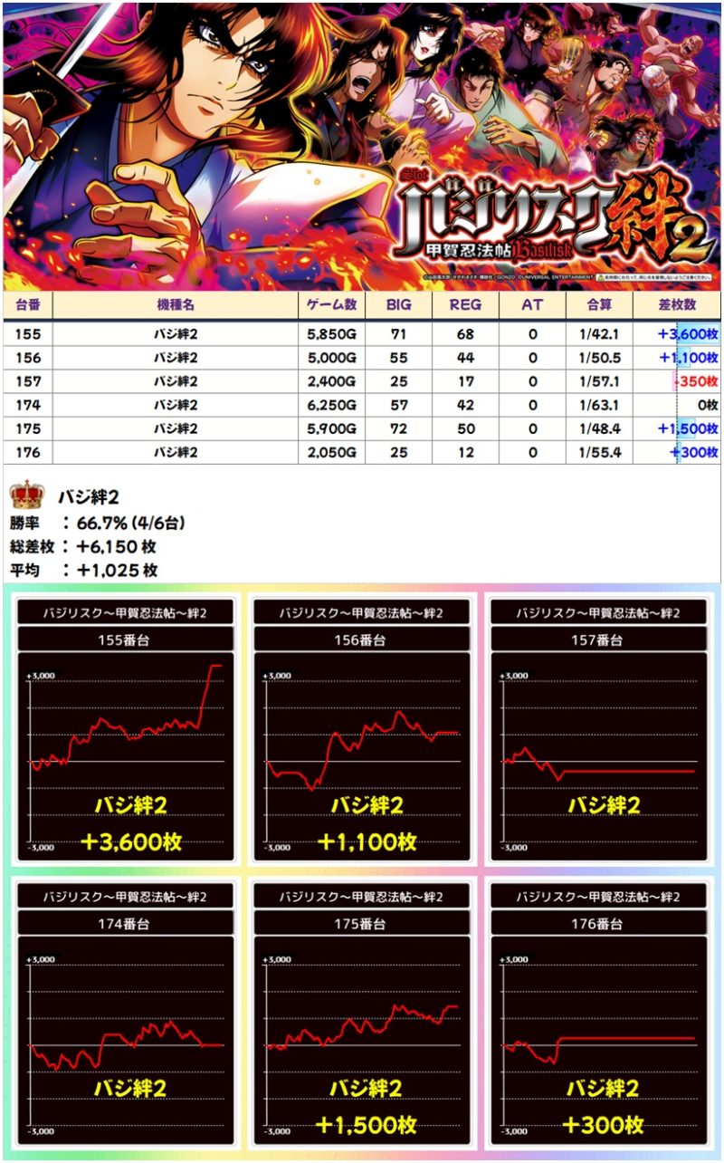 機種別で見ていくと、まずはバジ絆2! こちらは4/6でプラス差枚となり、平均+1025枚。157&176番台の打ち込みが足りなかっただけで、こちらはもしかしたら全台系だったかも!?
