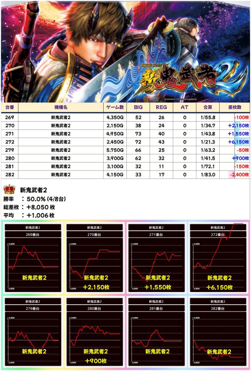 新鬼武者はキッチリと勝率ニブイチ! ニブイチ以上だったのは間違いなさそうですね。272番台からは+6000枚オーバーも!