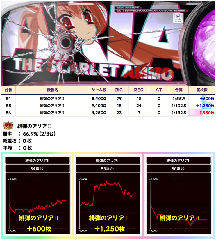 緋弾のアリアⅡは全体の結果こそ伴わなかったものの、グラフを見る限りプラスだった2台は高設定挙動。こちらもニブイチ以上だったと予想します