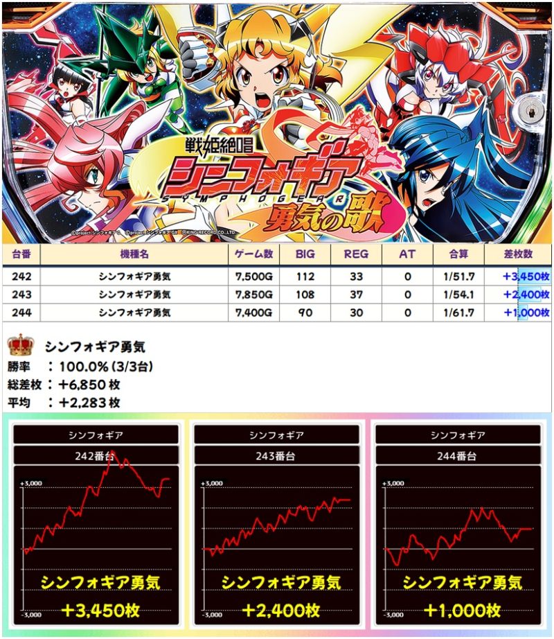 シンフォギアは文句なしの全台系と見ていいでしょう。全台しっかりと回されていましたね! 結果も全台プラスの平均+2283枚と好結果でした。