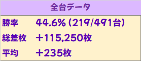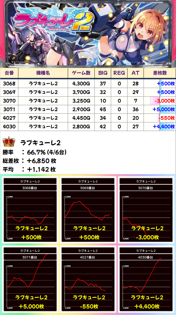 減台になりましたが推し機種です!6台設置の「ラブキューレ2」は6台中4台がプラスで平均+1,142枚の結果に!