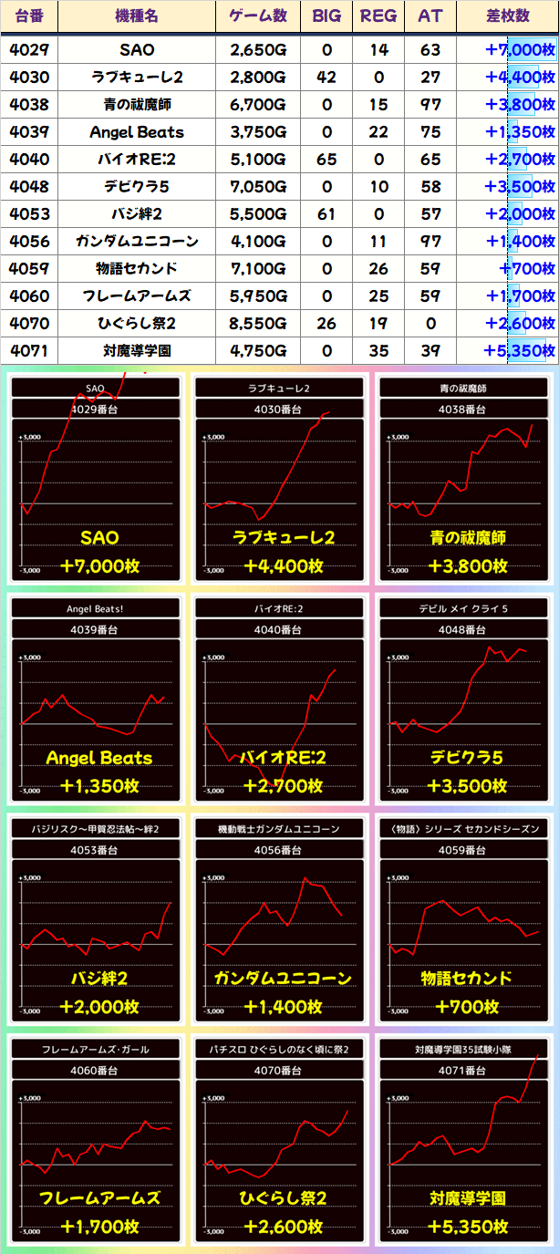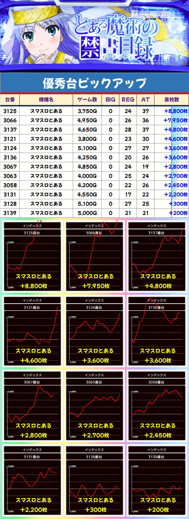 こちらも今後注目の「スマスロとある(インデックス)」。30台設置の「スマスロとある」は30台中13台がプラスで平均+265枚の結果に!8千枚クラスも複数台出ています!