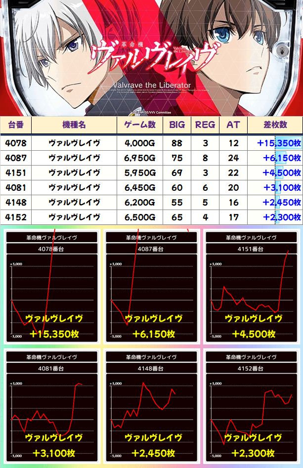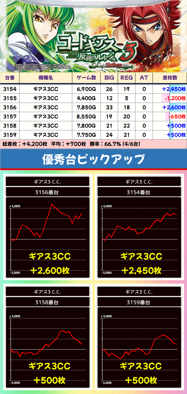 1/2以上がプラス台!6台設置の「ギアス3CC」は6台中4台がプラスで平均+700枚の結果に!