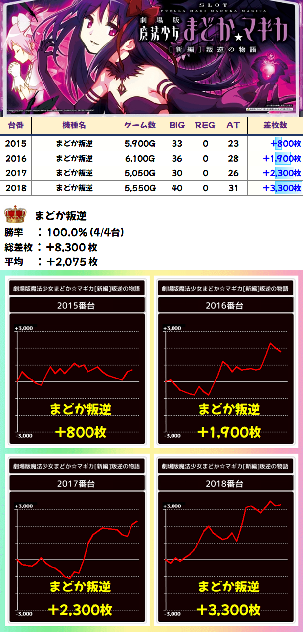 新台まどか導入時は旧まどかも狙い目!4台設置の「まどか叛逆」は4台全台がプラスで平均+2,075枚の結果に!