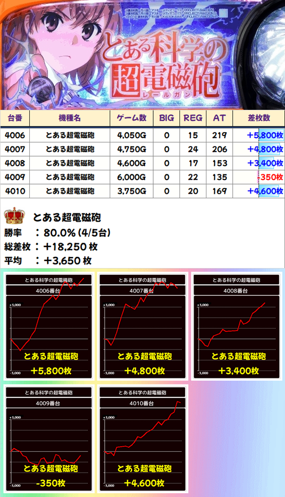 新台「スマスロとある」導入で旧とある電磁砲もバッチリ!5台設置の「とある超電磁砲」は5台中4台がプラスで平均+3,650枚の結果に!