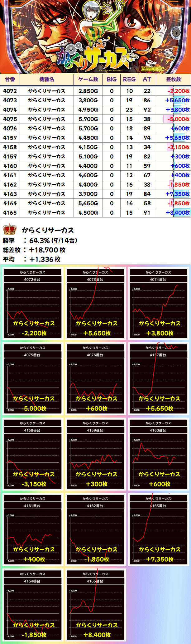 14台設置の「からくりサーカス」は14台中9台がプラスで機種総差枚+18,700枚、平均+1,336枚の結果に!