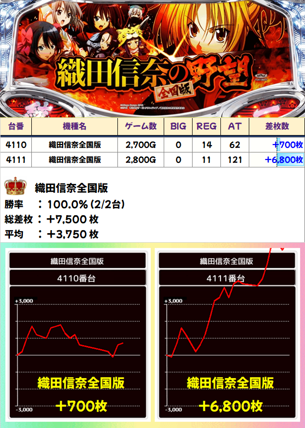 好調の少台数機種も抜かりなし!2台設置の「織田信奈全国版」は2台全台がプラスで平均+3,750枚の結果に!
