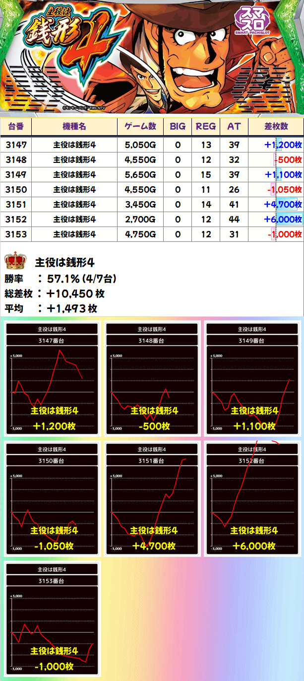 いろんなスマスロ元気です!7台設置の「主役は銭形4」は7台中4台がプラスで平均+1,493枚の結果に!