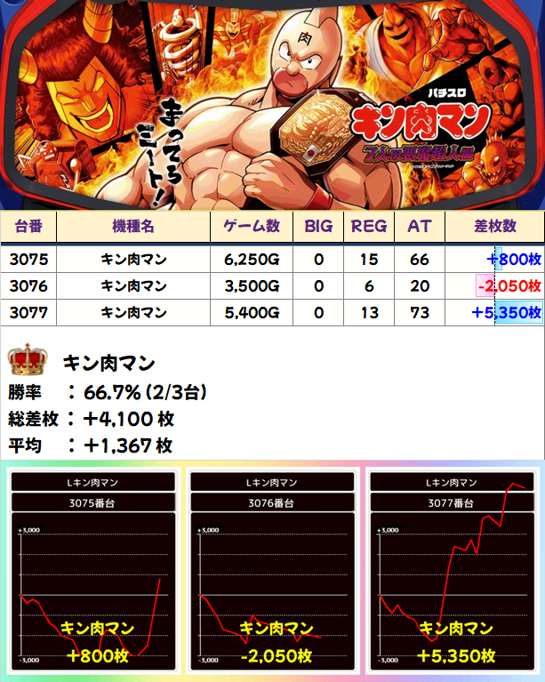 機種イチ⁉ 3台設置の「キン肉マン」は3台中2台がプラスで平均+1,367枚の結果に!