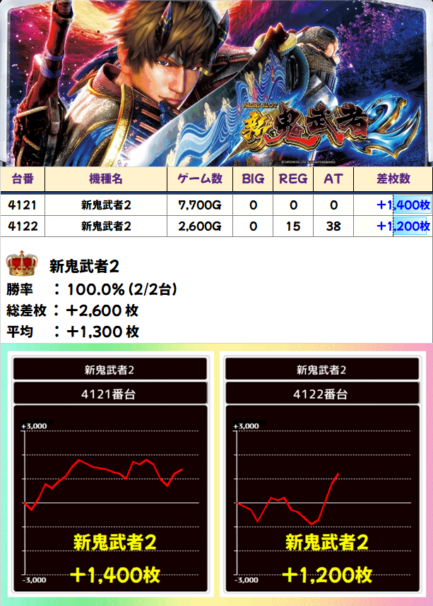 やはり2台機種も見逃せません!2台設置の「新鬼武者2」は2台全台がプラスで平均+1,300枚の結果に!
