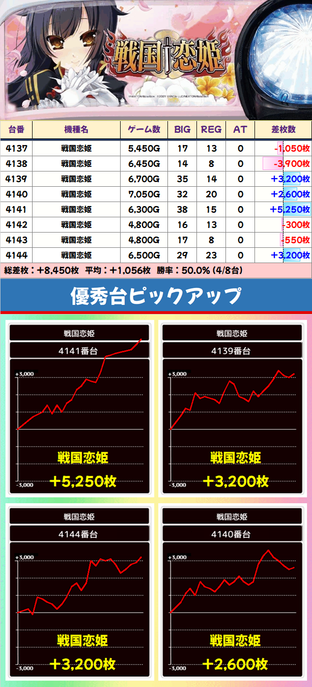 1/2がプラス台!8台設置の「戦国恋姫」は8台中4台がプラスで平均+1,056枚の結果に!