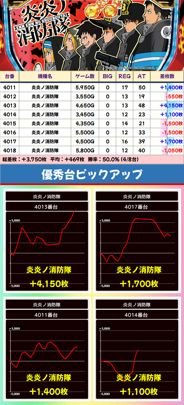 1/2がプラス台!8台設置の「炎炎ノ消防隊」は8台中4台がプラスで平均+469枚の結果に!
