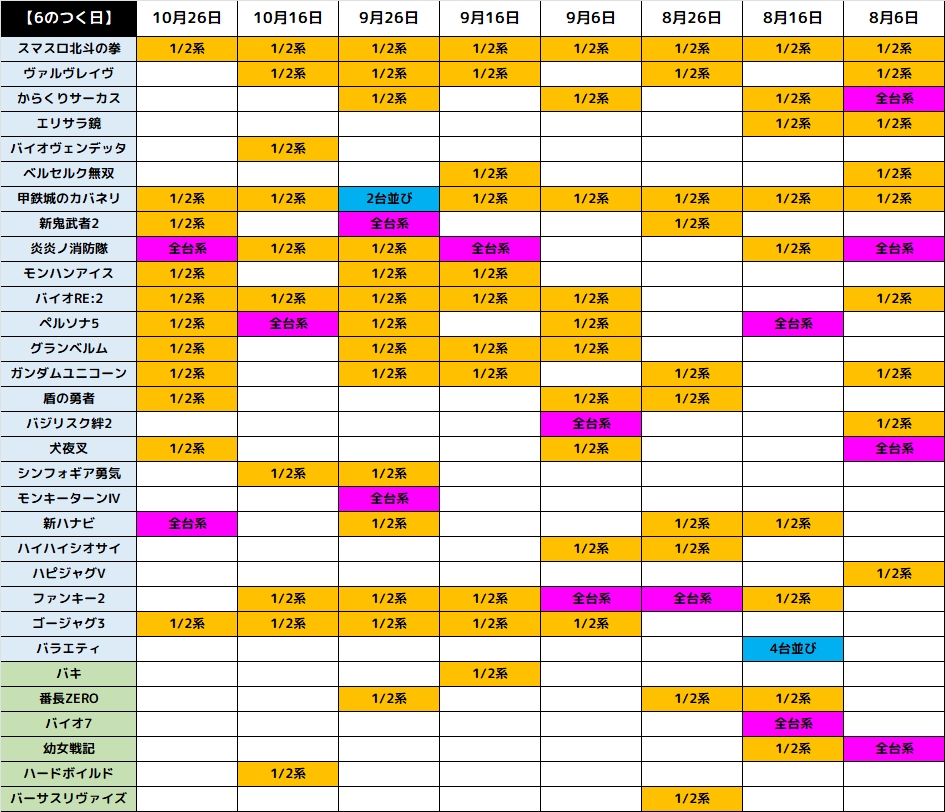なかでも注目なのは2台設置機種。上記の表の1/2系の仕掛けがあった機種のほとんどが2台設置機種なので2台設置機種を狙えばそれだけでお宝台ツモ率50%クラス。6のつく日は2台設置機種がアツアツです!
