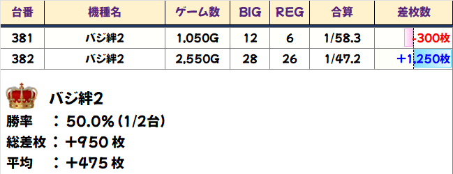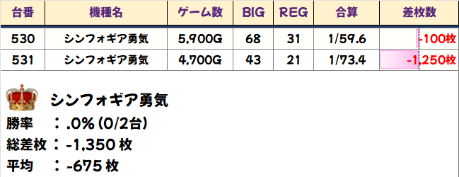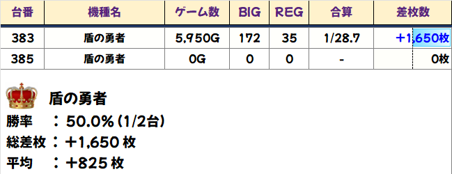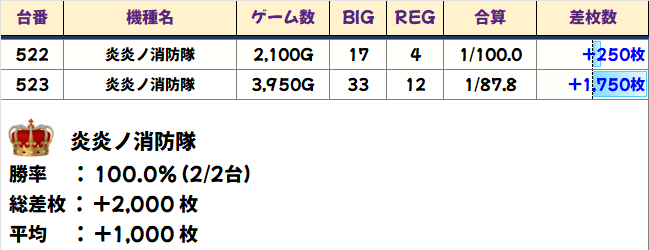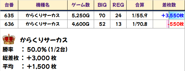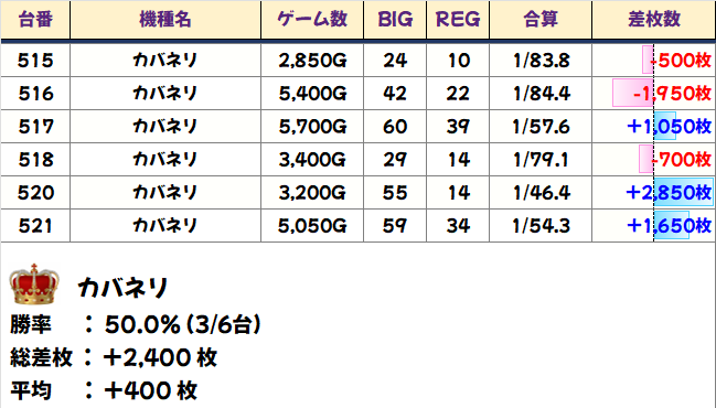 結果を見ると高設定濃厚台はしっかり出た感じ。マイナスで終わってしまった台の回転数も伸びているので、このあたりの台もお宝台だったのかも? となると「カバネリ」お宝台だらけ? 本日の「カバネリ」はかなりアツかったみたいですね。…ん? いつもか。
