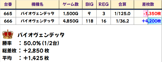 「バイオヴェンデッタ」も1/2系鉄板の666番台がある「バイオヴェンデッタ」は2台設置機種になったので6のつく日は毎回1/2以上濃厚! 全台系にも期待できそうですよ。