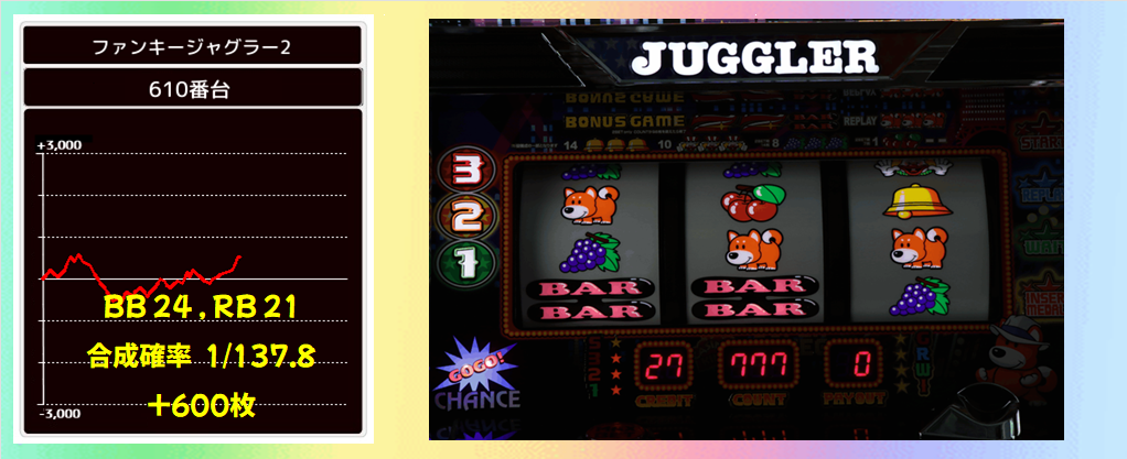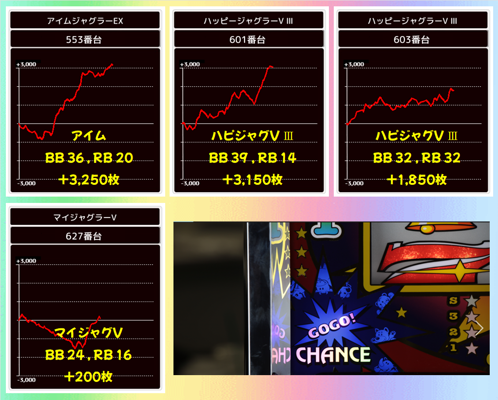 本日も「ゴージャグ3」と「ファンキー2」に仕掛けがありましたが、その他のジャグラーシリーズにもお宝台アリ。「ハピジャグV」の優秀台が1台飛ばしになっているので、602番台が不発に終わってしまった3台並びの仕掛けになっていたのかも?