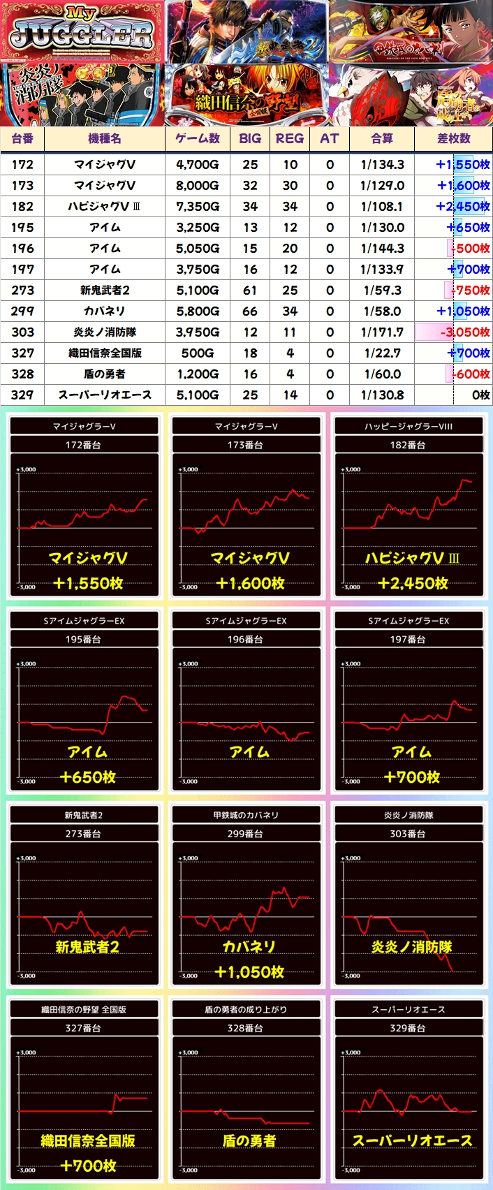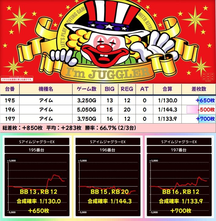 この日は様々な箇所にチャンスが散りばめられており、スマスロ・6.5号機・ジャグラーと幅広い機種に仕掛けが用意されていました。