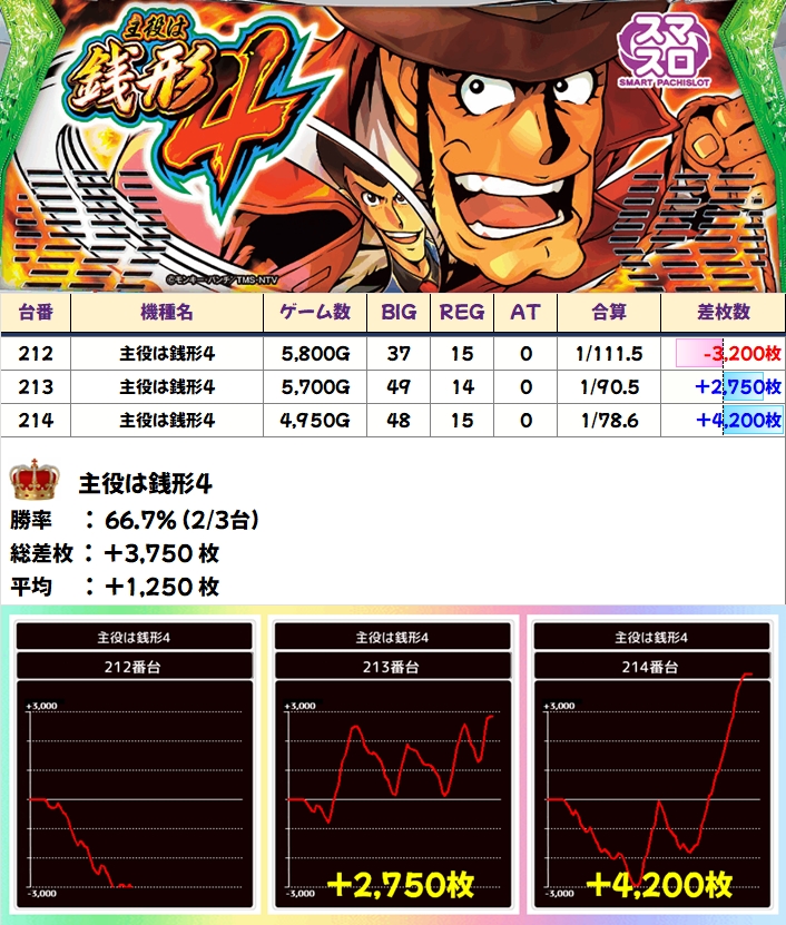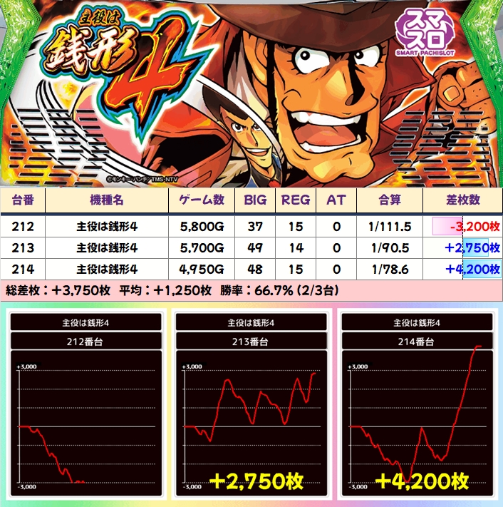 また、ハイスペックスマスロに新しく仲間入りした銭形4がいきなり全台系になったことも驚きでした。