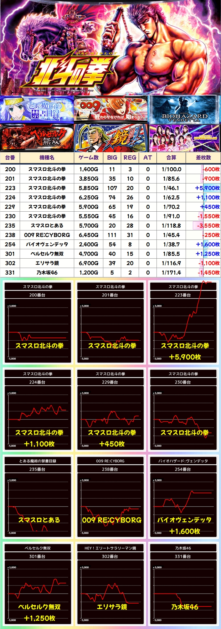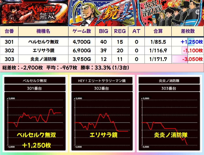 データのほうを見てみると、惜しくも一台だけ不発となっていますが、ゲーム数は全台しっかり回っているため、全台系だということは見抜かれていたのかなと。