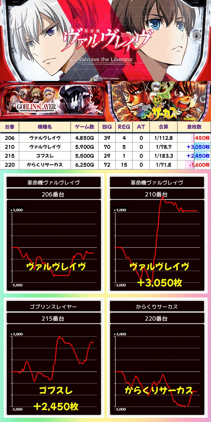 そのため、この日はヴァルヴレイヴ・からくりサーカス・ゴブスレ・銭形4の4機種が狙い目となっていました。