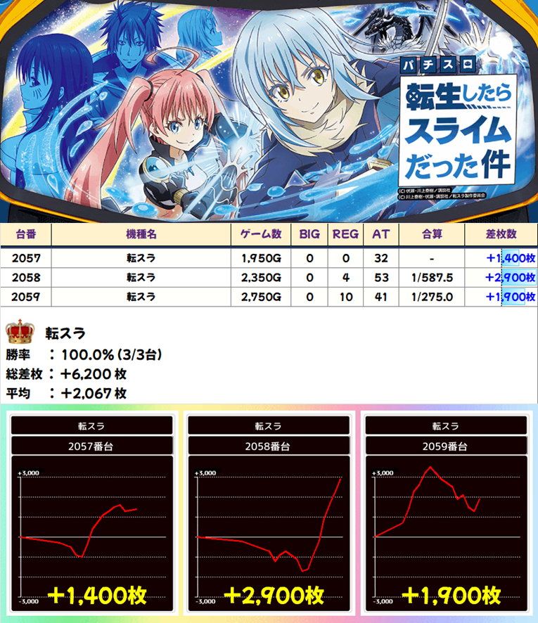 勝率100%かつ、平均差枚も2000枚超となった転スラ。こちらも全台系間違いないでしょう!