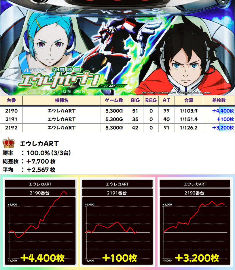最新台のエウレカARTが早速結果を出してくれました!こちらも間違いなく全台系でしょう!平均+2500枚と素晴らしすぎる結果に!