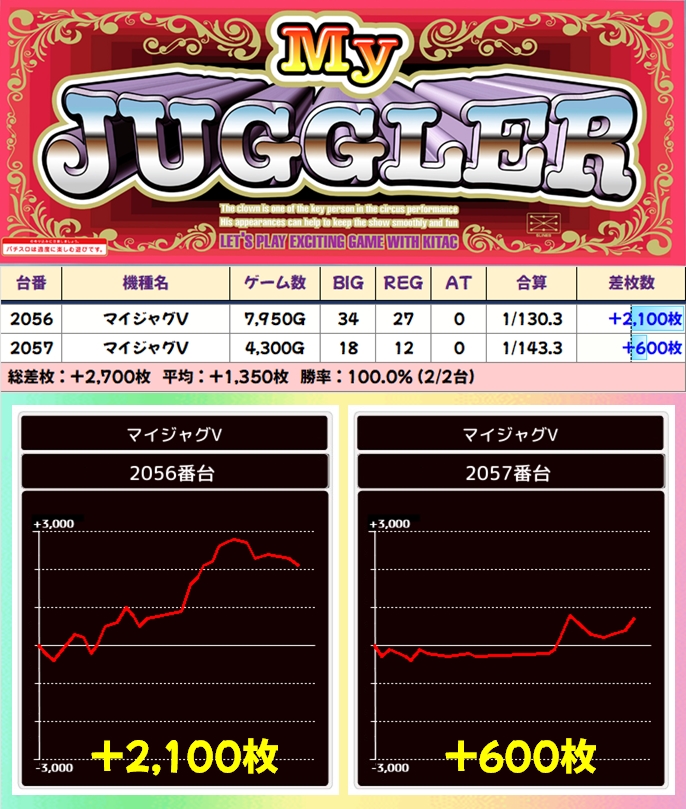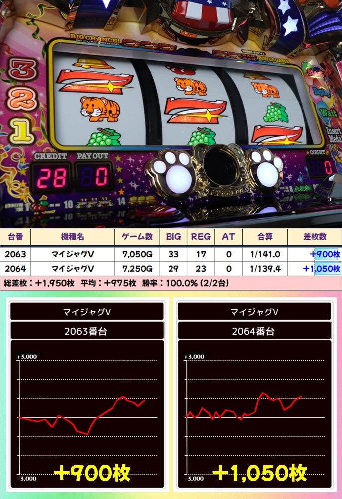 2台並びはマイジャグに2箇所用意されており、該当箇所は平均約+1000枚と上々な結果に!