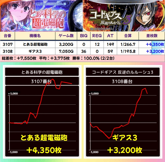 3Fの2台並びは機種またぎのパターンで、とある超電磁砲とギアス3はどちらも3台設置機種でした。