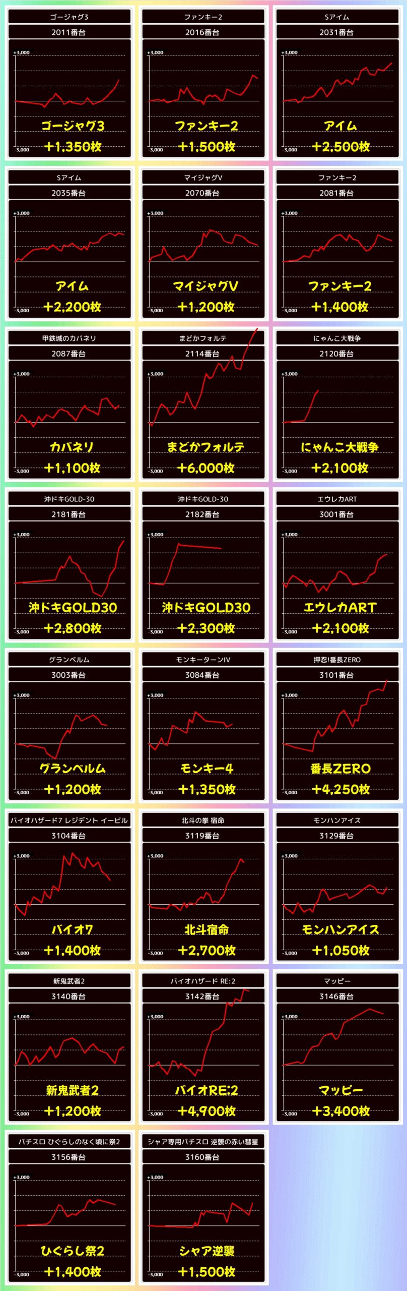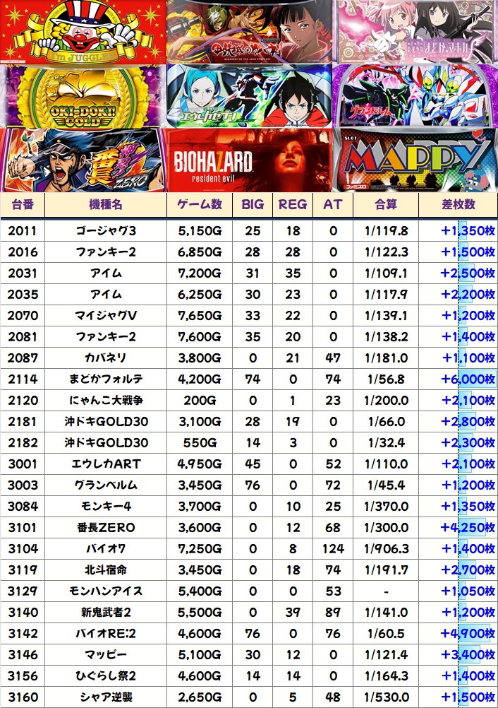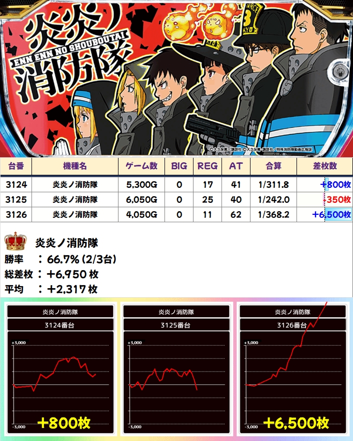 先ほどポスト示唆で触れた炎炎ノ消防隊は全台系の対象となっており、3126番台は+6500枚と大量出玉を記録!