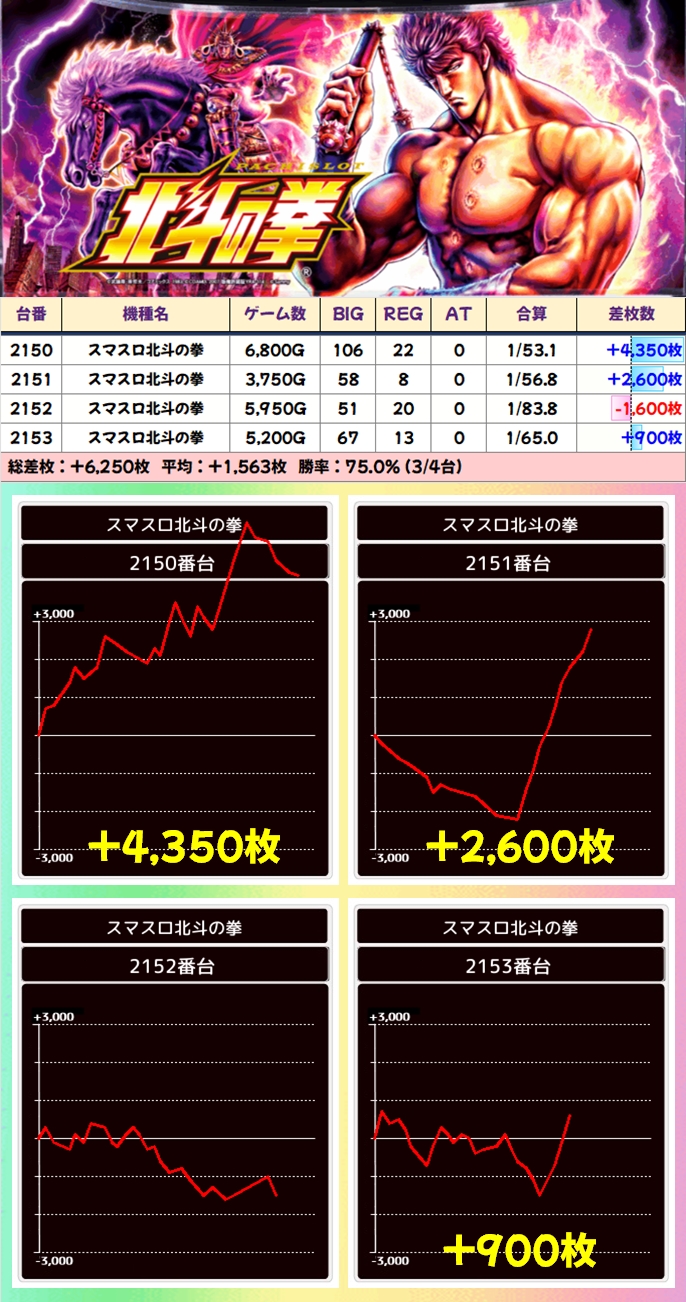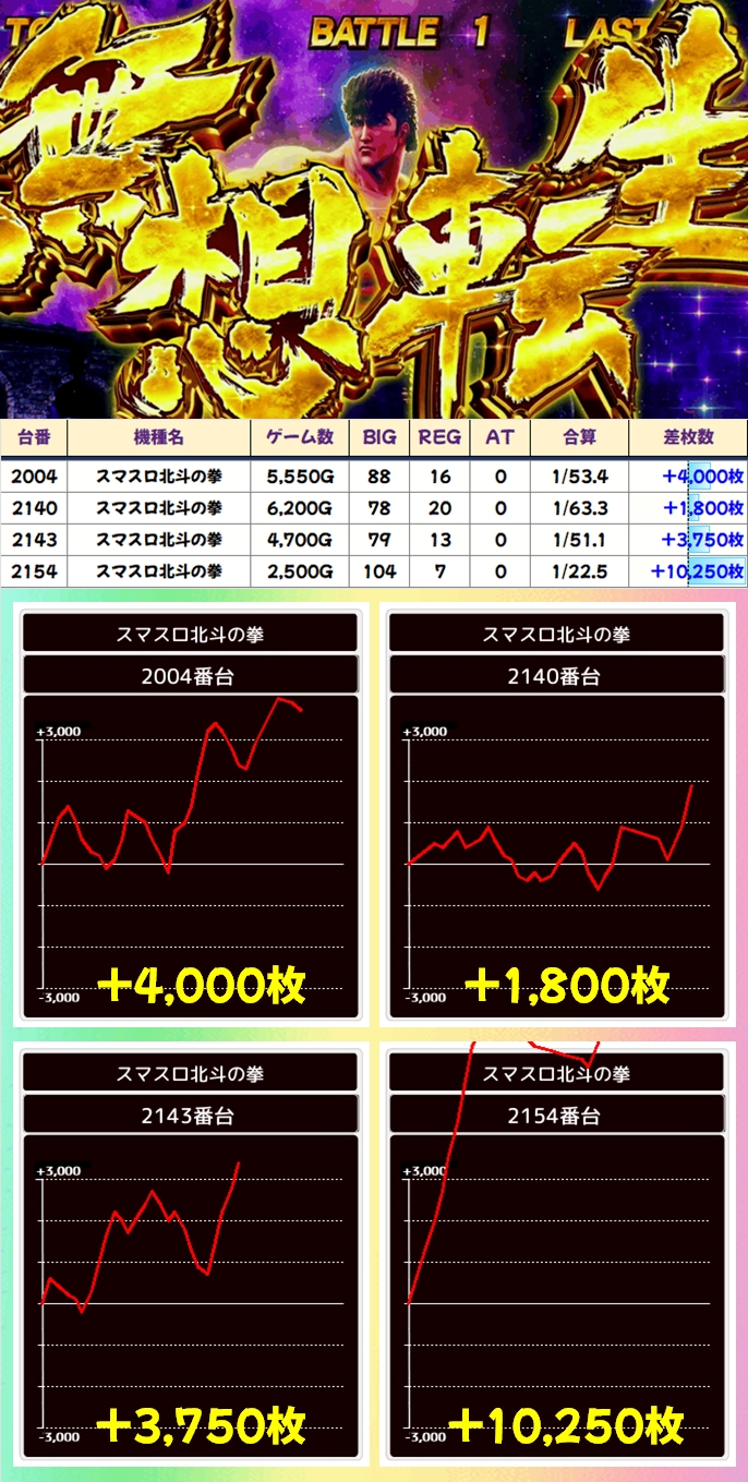 万枚オーバーの2154番台の他にも+4000枚、+3750枚と優秀台を複数確認でき、北斗全体でもしっかりプラス差枚を記録!