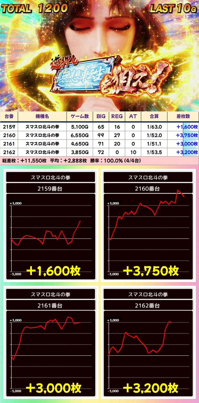 スマスロ北斗には4台並びが2本用意されており、1本目は平均+1500枚超、2本目は平均+2800枚超と素晴らしい結果に!