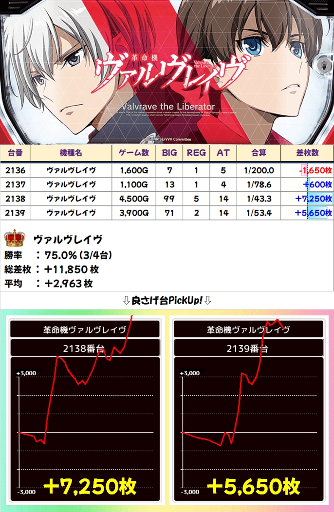 この日はスマスロに1/2系の仕掛けが用意されており、ヴァルヴレイヴからは+5000枚オーバーと+7000枚オーバーの台を確認できました。