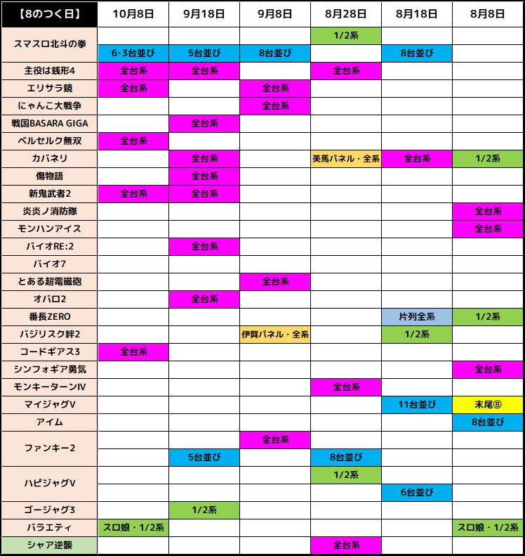 そんな8のつく日の仕掛けの傾向は以下の通り。