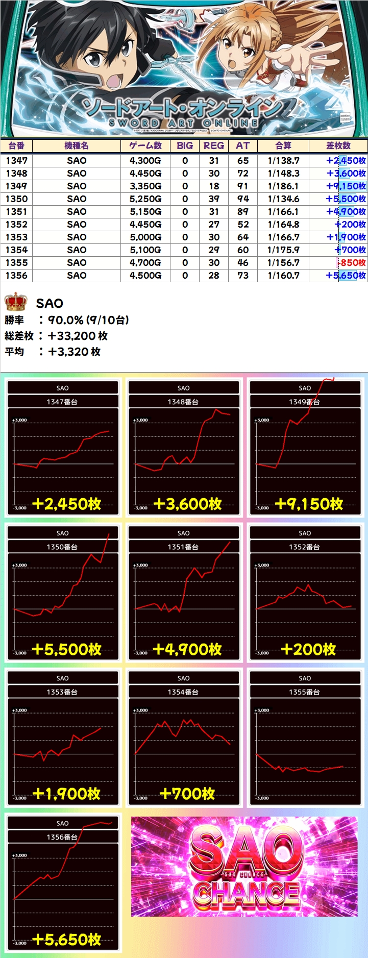 歌舞伎町店が力を入れているエンジョイ機種でもある「SAO」。+9150枚を筆頭に抜群の勝率で10台中5台が+3000枚以上を記録!