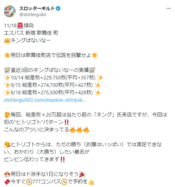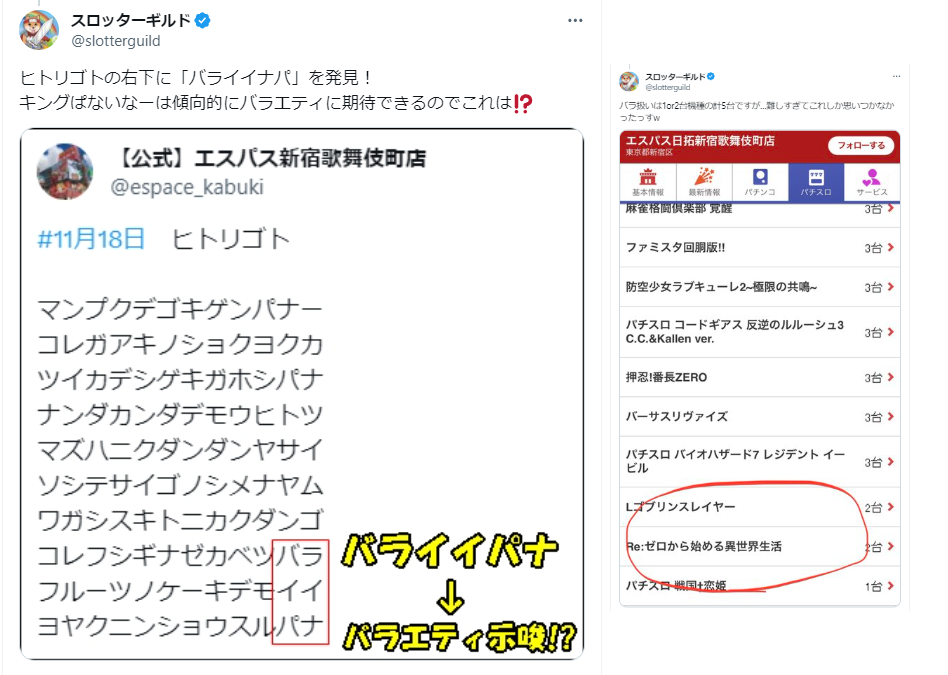 11月18日(土)|エスパス新宿歌舞伎町|大都機種の「エリサラ鏡・SAO・番長・Re:ゼロ」が怒涛の全台系で全て平均+2000枚以上の超爆発!