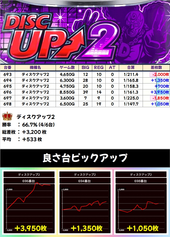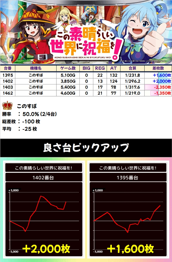 1/2系は3機種。エンジョイ機種の「戦国乙女4」には万枚、+6200枚。ノーマルの「ディスク2」は+3950枚を筆頭に3台が+1000枚以上。アツくめでたい日に仕掛け対象になりやすい「このすば」にも+2000枚、+1600枚の台がありました!