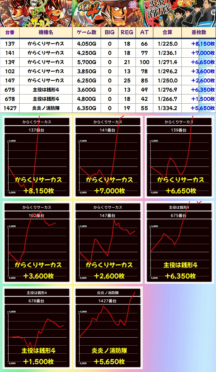 ただ、それ以上に活躍したのは「からくりサーカス」で+8150枚、+7000枚、+6650枚など5000枚オーバーの台がガッツリ出現!