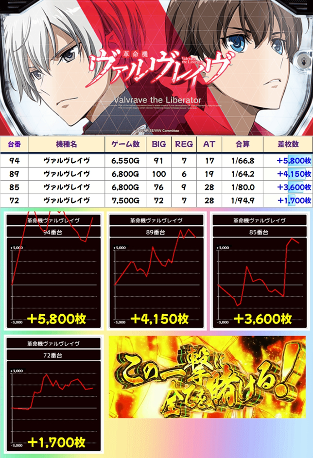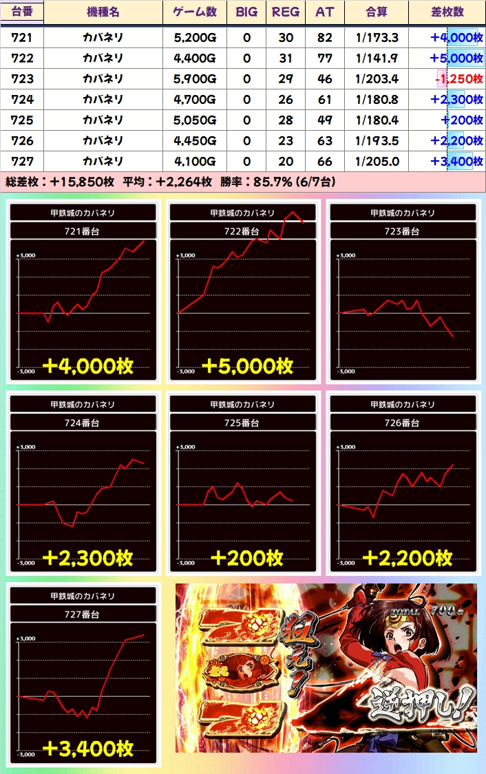 「カバネリ」には7台列がありましたが、+5000枚を筆頭に5台が+2000枚以上の好成績!