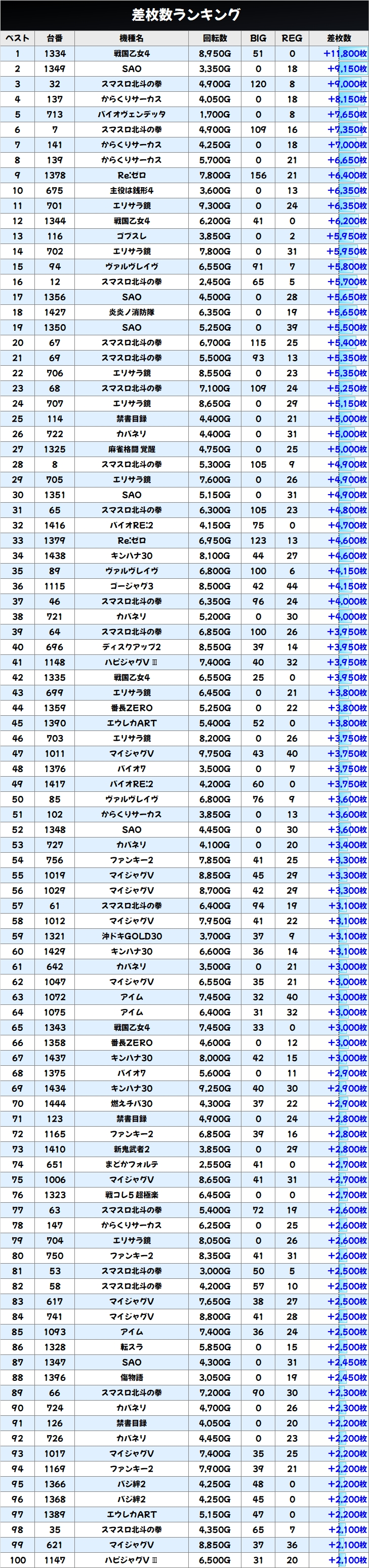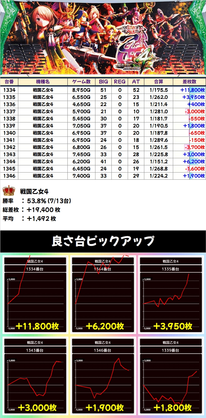 戦国乙女4の万枚を筆頭に優秀台が多数あり、100台を超える台が+2000枚以上! +1000枚以上に至っては184台もありました!