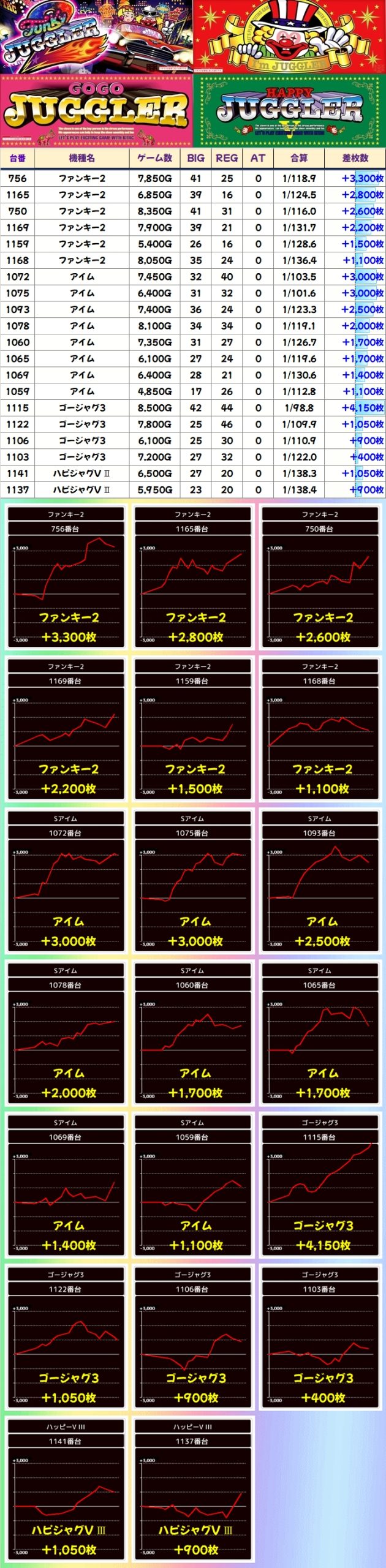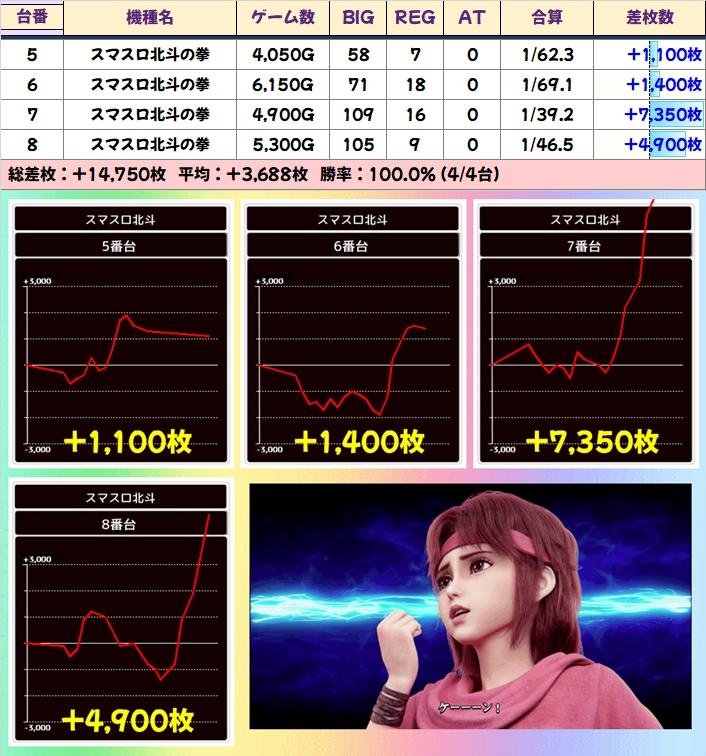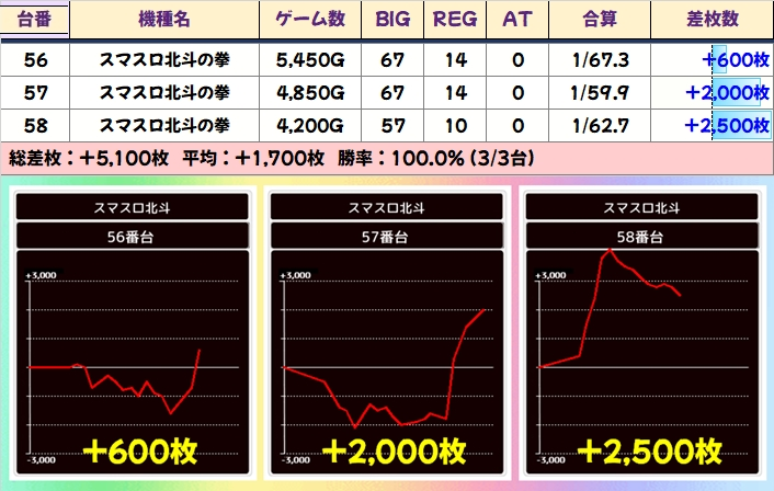 全体でもしっかりプラスでしたが、展開に恵まれない台も多かったのか少し物足りない結果に…。