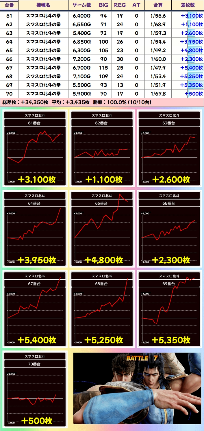 【10台並び】スマスロ北斗(61ー70番台):平均+3435枚