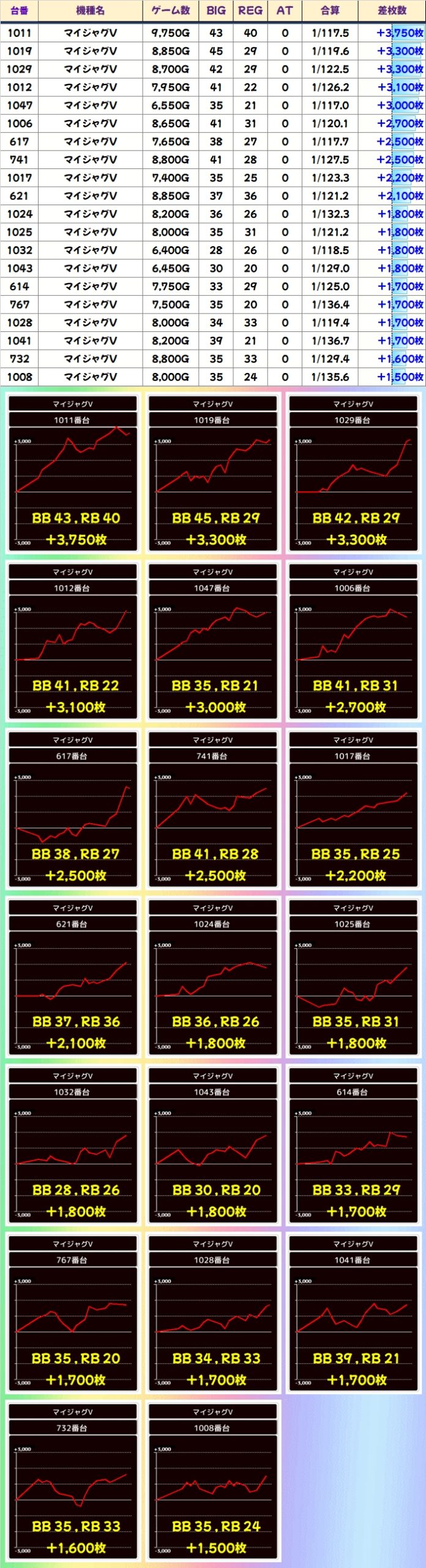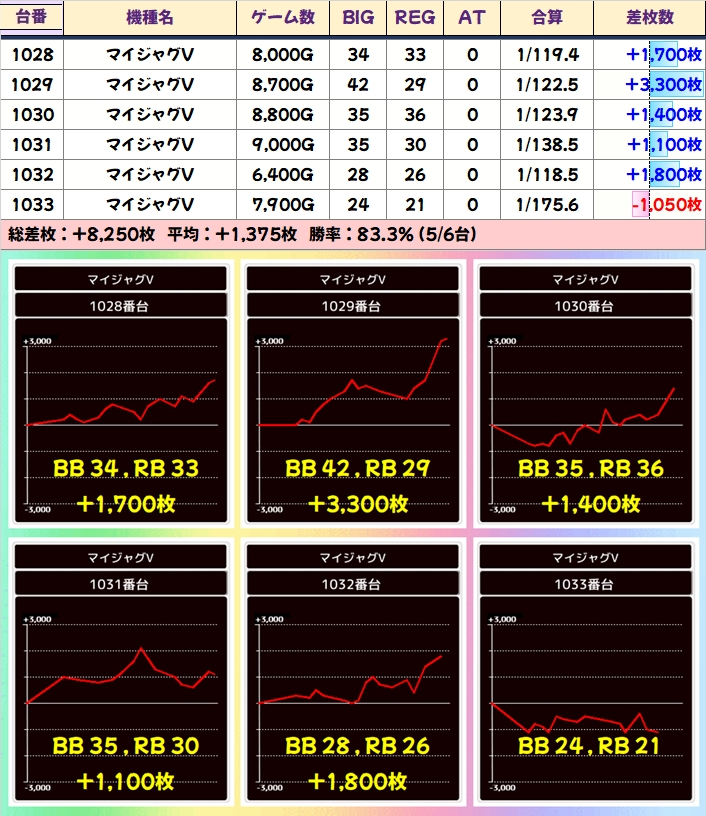 「マイジャグV」には+3300枚を筆頭に6台中5台が+1000枚以上の6台列がありました!