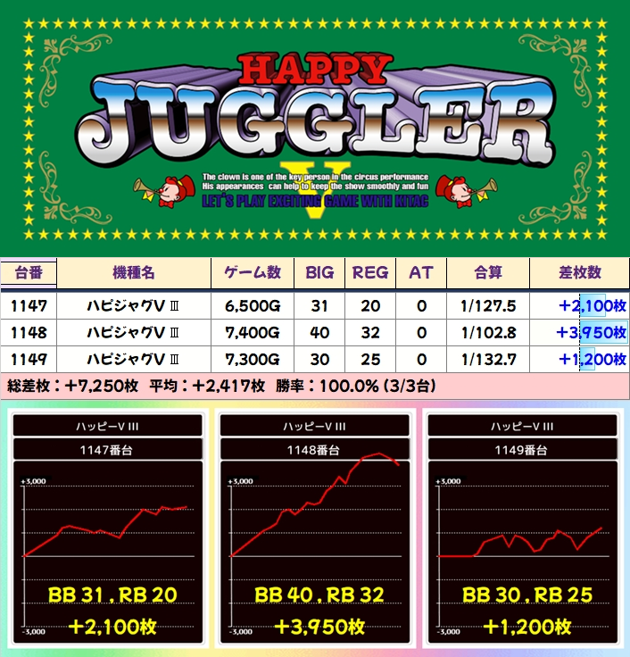 【3台並び】ハピジャグ (1147ー1149番台):平均+2417枚