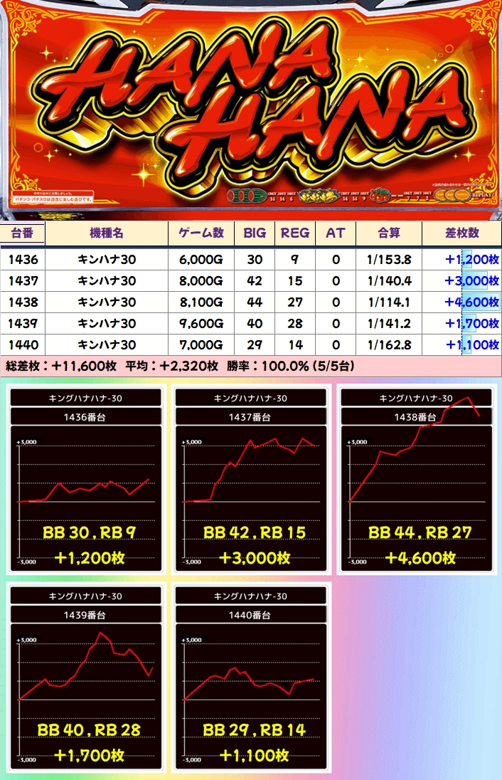 【5台並び】キングハナハナ(1436ー1440番台):平均+2320枚